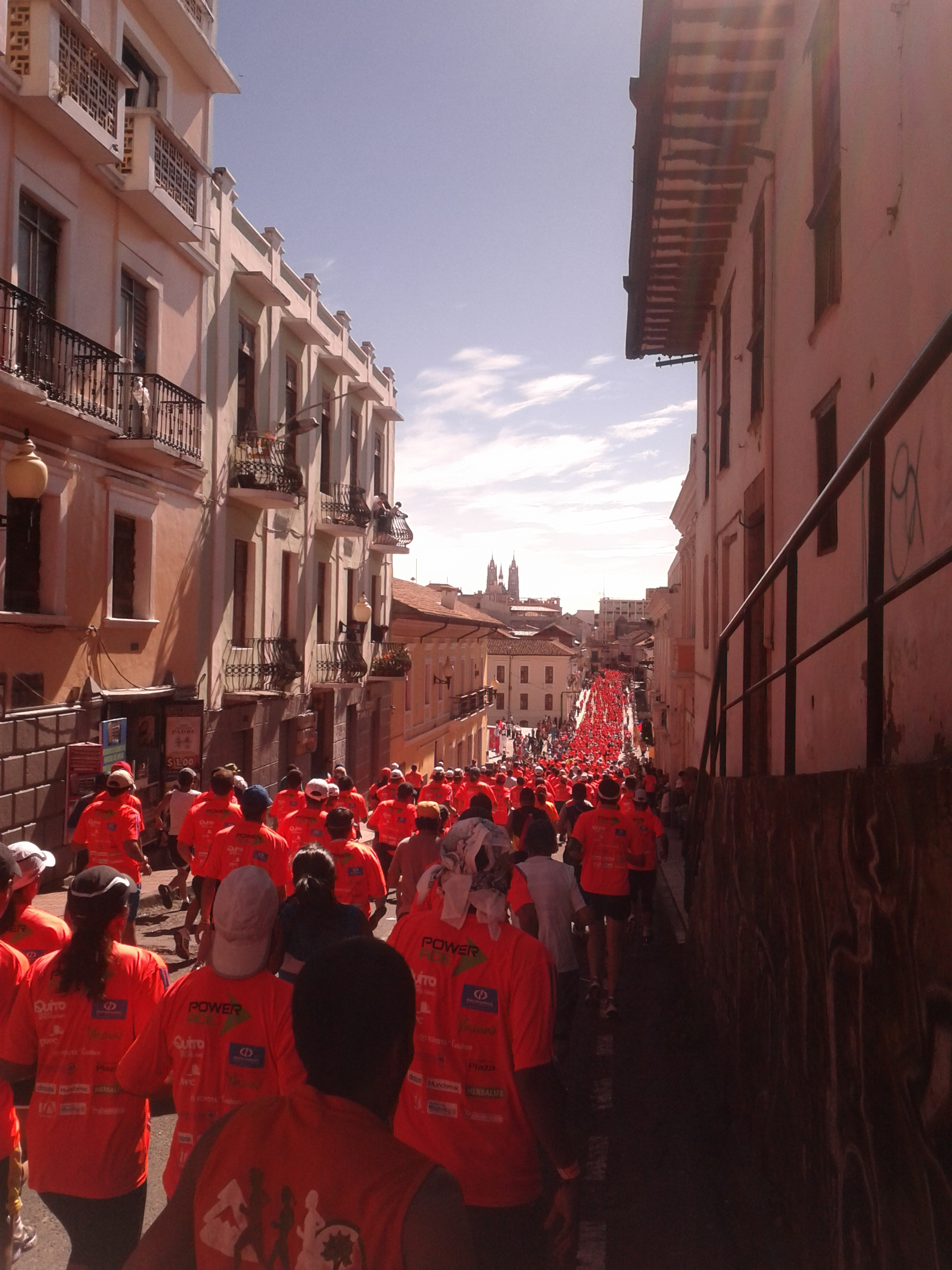 Estaba saliendo a toda marcha del sur de Quito y entrando en el centro histórico. Ya me dolían las piernas y mi boca estaba seca por el sol que me pegaba como suele hacer a 2800 metros de altura más cerca a Dios que el resto de seres humanos. En los costados de la calle los moradores asumían su papel no solo de observadores sino de participantes. Nos ofrecían agua y frutas, y compartían dolor, y nos animaban con frases que invocaban que resistimos en la carrera.